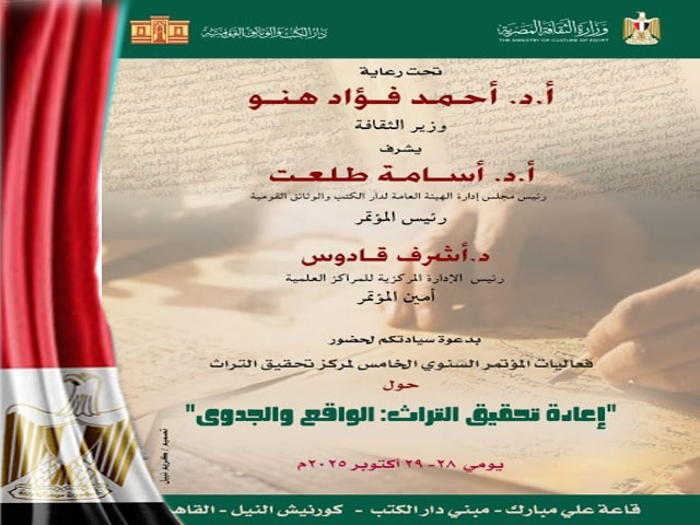 في إطار جهود وزارة الثقافة للحفاظ على التراث العربي والإسلامي وإبراز قيمته المعرفية والحضارية، تتشرف الهيئة العامة لدار الكتب والوثائق القومية، برئاسة الأستاذ الدكتور أسامة طلعت، بدعوتكم لتغطية فعاليات المؤتمر السنوي الخامس لمركز تحقيق التراث، والذي يُعقد تحت عنوان: «إعادة تحقيق التراث: الواقع والجدوى» وذلك خلال يومي الثلاثاء والأربعاء الموافقين 28 – 29 أكتوبر 2025م، في قاعة علي مبارك بمقر الهيئة على كورنيش النيل – رملة بولاق – القاهرة. يُقام المؤتمر تحت رعاية أ.د. أحمد فؤاد هنو – وزير الثقافة، وأ.د. أسامة طلعت – رئيس مجلس إدارة الهيئة العامة لدار الكتب والوثائق القومية ورئيس المؤتمر، وتنظمه الإدارة المركزية للمراكز العلمية برئاسة د. أشرف قادوس – أمين عام المؤتمر، ومركز تحقيق التراث برئاسة أ. مصطفى عبد السميع – مدير عام المركز ومقرر المؤتمر. يهدف المؤتمر إلى بحث قضايا إعادة تحقيق التراث العربي والإسلامي، ومناقشة جدوى إعادة إخراج النصوص المحققة في ضوء المستجدات العلمية والتقنية، كما يتناول دور الذكاء الاصطناعي في تحقيق المخطوطات وحفظها. وتنطلق الجلسة الافتتاحية في تمام الساعة العاشرة صباحًا من يوم الثلاثاء 28 أكتوبر، بمشاركة نخبة من الأساتذة والباحثين من الجامعات المصرية والعربية.