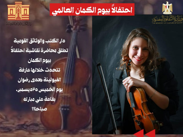 في إطار اهتمام وزارة الثقافة بالاحتفاء بالفنون ودعم الإبداع الموسيقي، وتنفيذًا لرسالتها في تعزيز الوعي الثقافي، تنظم دار الكتب والوثائق القومية، برئاسة الأستاذ الدكتور أسامة طلعت، مناقشة ومحاضرة ثقافية موسيقية بعنوان «أنغام في يوم الكمان»، وذلك بمناسبة اليوم العالمي للكمان، وتنظمها قاعة الموسيقى بدار الكتب تحت إدارة الأستاذة رشا أحمد.